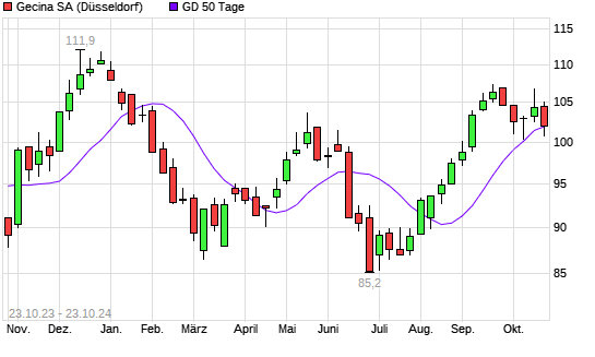 Die Gecina-Aktie befindet sich seit dem 23.08.2024 im langfristigen Aufwärtstrend und hat in diesem Zeitraum +4,27% an Wert gewonnen. Der Abstand zur 200-Tage-Linie beträgt aktuell +4,98%.