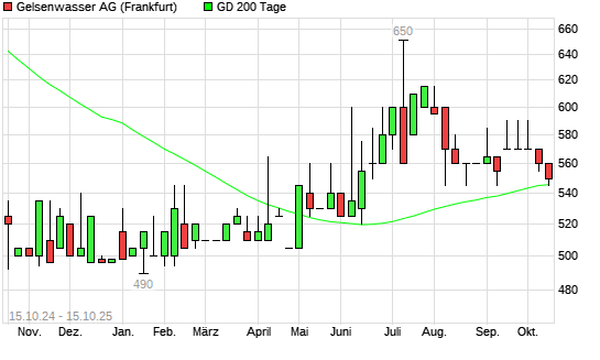 Mit dem Anstieg auf 550,00 EUR hat die Gelsenwasser-Aktie am 14.10.2025 die 200-Tage-Linie nach oben gekreuzt.
