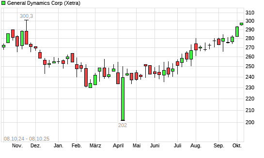 Mit dem Anstieg auf 297,05 EUR hat die General Dynamics-Aktie (ISIN US3695501086) am 07.10.2025 ein neues 6-Monats-Hoch erreicht und damit den Kurs vom 06.10.2025 eingestellt.