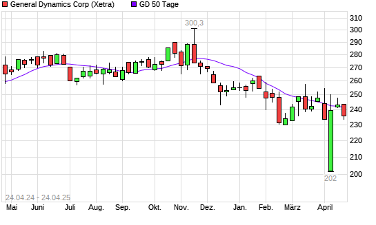 Mit dem Anstieg auf 242,10 EUR hat die General Dynamics-Aktie am 23.04.2025 die 50-Tage-Linie nach oben gekreuzt.
