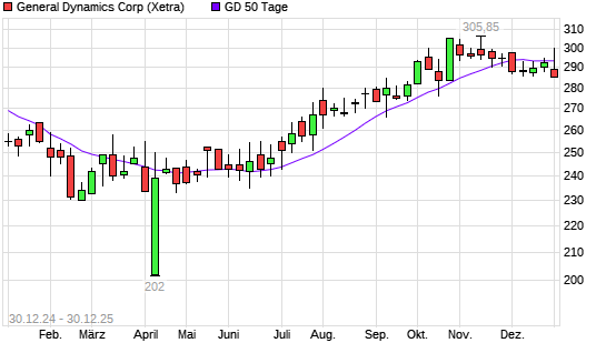 Mit dem Rücksetzer auf 289,40 EUR hat die General Dynamics-Aktie am 29.12.2025 die 50-Tage-Linie nach unten gekreuzt.Die General Dynamics-Aktie befindet sich seit dem 09.07.2025 im langfristigen ...weiterlesen