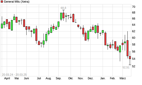 Mit dem Rücksetzer auf 54,13 EUR hat die General Mills-Aktie (ISIN US3703341046) am 19.03.2025 ein neues 3-Jahres-Tief erreicht und damit den Kurs vom 18.02.2025 eingestellt.