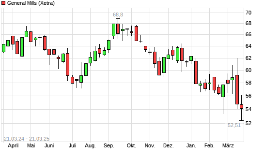 Mit dem Rücksetzer auf 53,54 EUR hat die General Mills-Aktie (ISIN US3703341046) am 20.03.2025 ein neues 3-Jahres-Tief erreicht und damit den Kurs vom 19.03.2025 eingestellt.