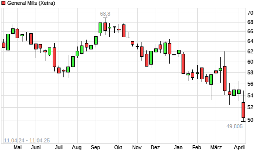 Mit dem Rücksetzer auf 51,25 EUR hat die General Mills-Aktie (ISIN US3703341046) am 10.04.2025 ein neues 3-Jahres-Tief erreicht und damit den Kurs vom 08.04.2025 eingestellt.