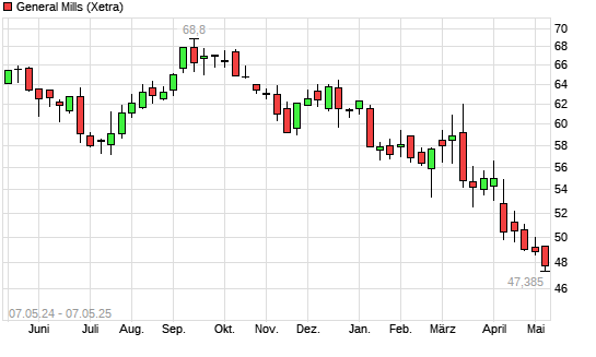 Mit dem Rücksetzer auf 48,01 EUR hat die General Mills-Aktie (ISIN US3703341046) am 06.05.2025 ein neues 3-Jahres-Tief erreicht und damit den Kurs vom 29.04.2025 eingestellt.