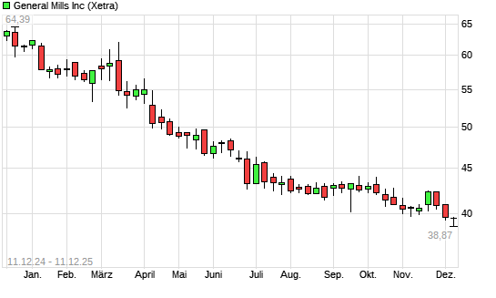 Mit dem Rücksetzer auf 39,26 EUR hat die General Mills-Aktie (ISIN US3703341046) am 10.12.2025 ein neues 5-Jahres-Tief erreicht und damit den Kurs vom 04.12.2025 eingestellt.