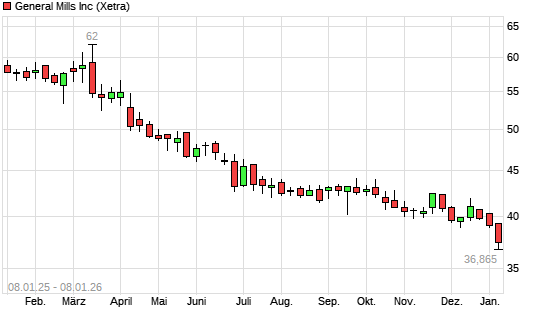 Mit dem Rücksetzer auf 36,90 EUR hat die General Mills-Aktie (ISIN US3703341046) am 07.01.2026 ein neues 5-Jahres-Tief erreicht und damit den Kurs vom 06.01.2026 eingestellt.
