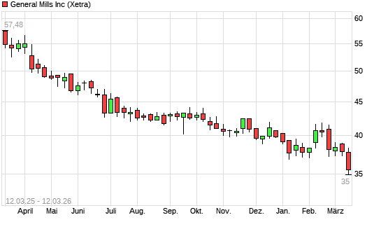 Mit dem Rücksetzer auf 35,32 EUR hat die General Mills-Aktie (ISIN US3703341046) am 11.03.2026 ein neues 5-Jahres-Tief erreicht und damit den Kurs vom 10.03.2026 eingestellt.