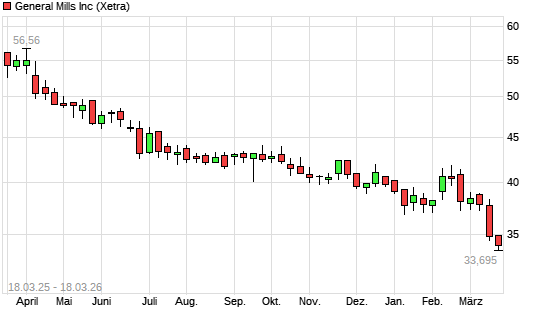 Mit dem Rücksetzer auf 33,79 EUR hat die General Mills-Aktie (ISIN US3703341046) am 17.03.2026 ein neues 5-Jahres-Tief erreicht und damit den Kurs vom 16.03.2026 eingestellt.