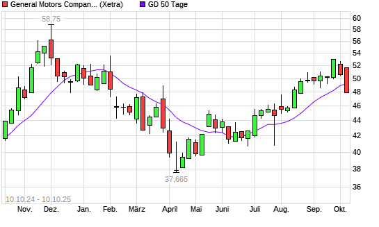 Mit dem Rücksetzer auf 48,51 EUR hat die General Motors-Aktie am 09.10.2025 die 50-Tage-Linie nach unten gekreuzt.
