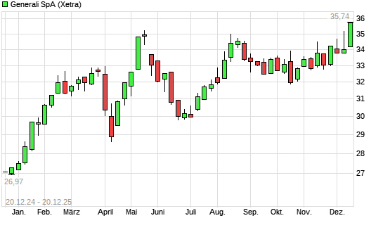 Mit dem Anstieg auf 35,79 EUR hat die Generali-Aktie (ISIN IT0000062072) am 19.12.2025 ein neues 10-Jahres-Hoch erreicht und damit den Kurs vom 17.12.2025 eingestellt.
