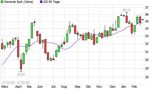 Mit dem Anstieg auf 35,16 EUR hat die Generali-Aktie am 16.02.2026 die 50-Tage-Linie nach oben gekreuzt.