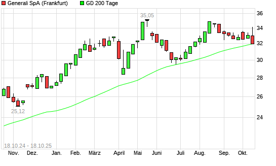 Mit dem Rücksetzer auf 31,96 EUR hat die Generali-Aktie am 17.10.2025 die 200-Tage-Linie nach unten gekreuzt.