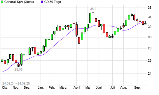 Mit dem Rücksetzer auf 33,01 EUR hat die Generali-Aktie am 23.09.2025 die 50-Tage-Linie nach unten gekreuzt.