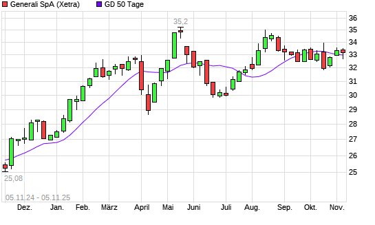 Mit dem Rücksetzer auf 32,84 EUR hat die Generali-Aktie am 04.11.2025 die 50-Tage-Linie nach unten gekreuzt.