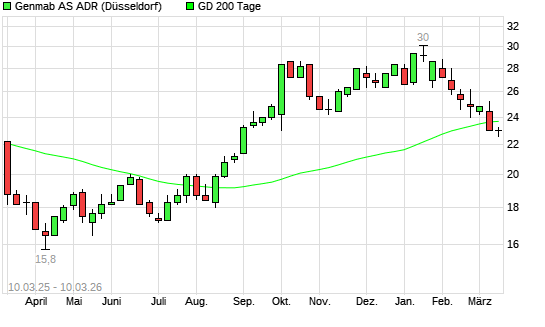 Mit dem Rücksetzer auf 23,80 EUR hat die Genmab A/S-Aktie am 09.03.2026 die 200-Tage-Linie nach unten gekreuzt. Die Genmab 10 Sponsored ADR-Aktie befindet sich jetzt sowohl ...weiterlesen