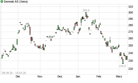 Mit dem Rücksetzer auf 226,90 EUR hat die Genmab-Aktie (ISIN DK0010272202) am 13.03.2026 ein neues 6-Monats-Tief erreicht und damit den Kurs vom 12.03.2026 eingestellt.