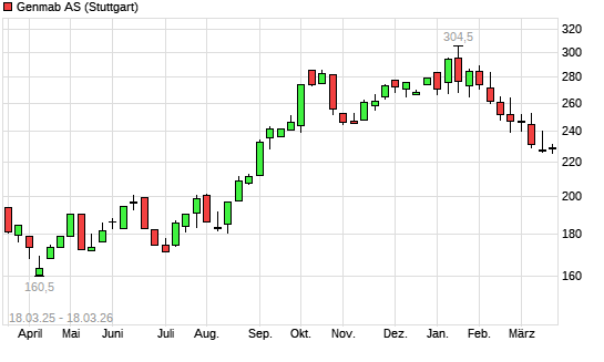 Mit dem Rücksetzer auf 226,50 EUR hat die Genmab-Aktie (ISIN DK0010272202) am 17.03.2026 ein neues 6-Monats-Tief erreicht und damit den Kurs vom 13.03.2026 eingestellt.