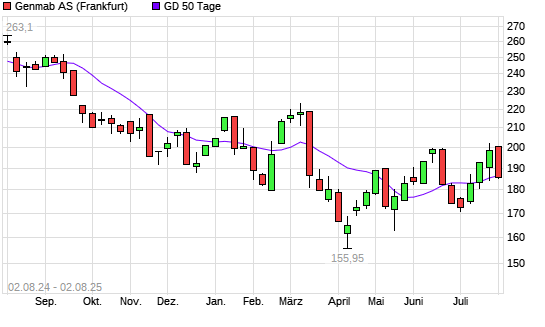Mit dem Rücksetzer auf 185,65 EUR hat die Genmab-Aktie am 01.08.2025 die 50-Tage-Linie nach unten gekreuzt.