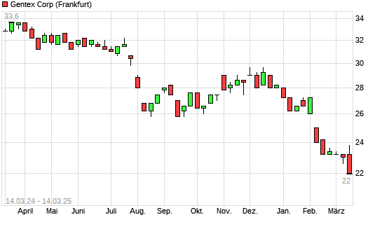 Mit dem Rücksetzer auf 22,40 EUR hat die Gentex-Aktie (ISIN US3719011096) am 13.03.2025 ein neues 3-Jahres-Tief erreicht und damit den Kurs vom 05.03.2025 eingestellt.