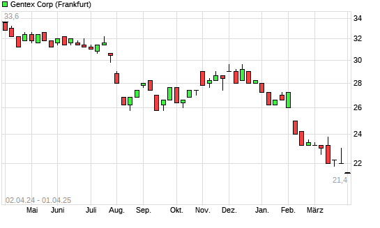 Mit dem Rücksetzer auf 21,40 EUR hat die Gentex-Aktie (ISIN US3719011096) am 31.03.2025 ein neues 3-Jahres-Tief erreicht und damit den Kurs vom 19.03.2025 eingestellt.