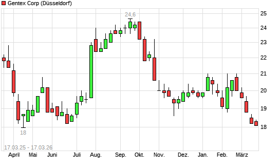 Mit dem Rücksetzer auf 18,40 EUR hat die Gentex-Aktie (ISIN US3719011096) am 16.03.2026 ein neues 6-Monats-Tief erreicht und damit den Kurs vom 13.03.2026 eingestellt.