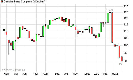 Mit dem Rücksetzer auf 90,14 EUR hat die Genuine Parts Company-Aktie (ISIN US3724601055) am 16.03.2026 ein neues 5-Jahres-Tief erreicht und damit den Kurs vom 13.03.2026 eingestellt.
