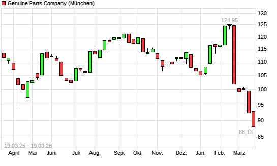 Mit dem Rücksetzer auf 87,72 EUR hat die Genuine Parts Company-Aktie (ISIN US3724601055) am 18.03.2026 ein neues 5-Jahres-Tief erreicht und damit den Kurs vom 17.03.2026 eingestellt.