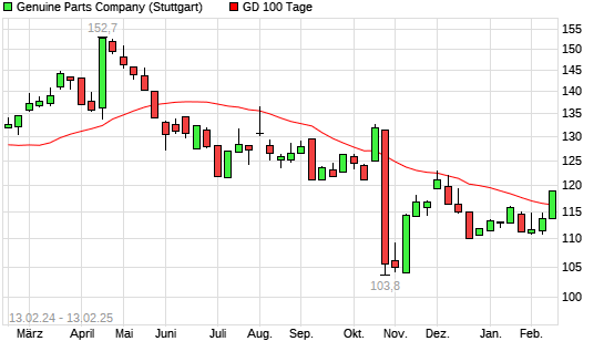 Mit dem Anstieg auf 116,85 EUR hat die Genuine Parts Company-Aktie am 12.02.2025 die 100-Tage-Linie nach oben gekreuzt.