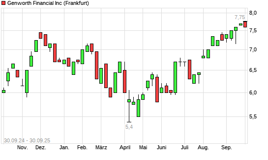 Mit dem Anstieg auf 7,75 EUR hat die Genworth Financial-Aktie (ISIN US37247D1063) am 29.09.2025 ein neues 10-Jahres-Hoch erreicht und damit den Kurs vom 26.09.2025 eingestellt.