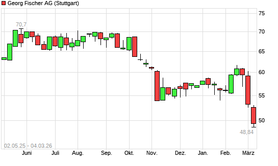 Mit dem Rücksetzer auf 51,45 EUR hat die Georg Fischer-Aktie (ISIN CH1169151003) am 03.03.2026 ein neues 12-Monats-Tief erreicht und damit den Kurs vom 02.03.2026 eingestellt.