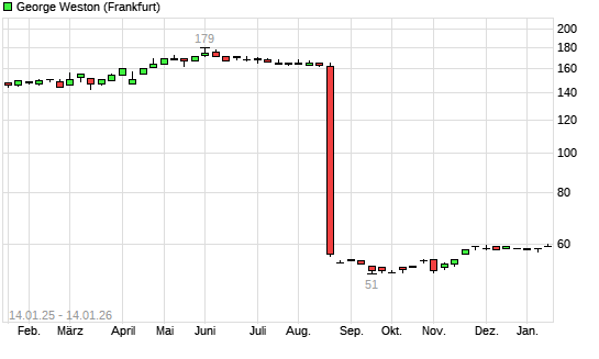 Mit dem Anstieg auf 60,00 EUR hat die George Weston-Aktie (ISIN CA9611485090) am 13.01.2026 ein neues All-Time-High erreicht und damit den Kurs vom 29.05.2025 eingestellt.