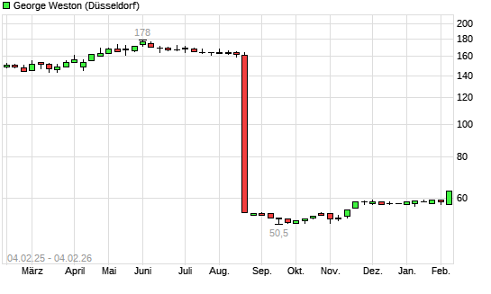 Mit dem Anstieg auf 62,00 EUR hat die George Weston-Aktie (ISIN CA9611485090) am 03.02.2026 ein neues All-Time-High erreicht und damit den Kurs vom 13.01.2026 eingestellt.