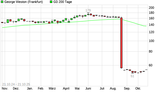 Die George Weston-Aktie befand sich seit dem 15.09.2025 im langfristigen Abwärtstrend und hat in diesem Zeitraum +2,56% an Wert gewonnen.