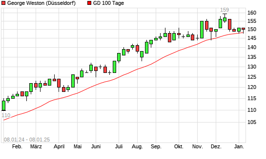 Mit dem Rücksetzer auf 149,00 EUR hat die George Weston-Aktie am 07.01.2025 die 100-Tage-Linie nach unten gekreuzt.