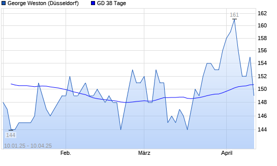 Mit dem Rücksetzer auf 151,00 EUR hat die George Weston-Aktie am 09.04.2025 die 38-Tage-Linie nach unten gekreuzt.