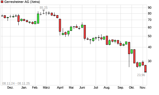 Mit dem Rücksetzer auf 24,00 EUR hat die Gerresheimer-Aktie (ISIN DE000A0LD6E6) am 07.11.2025 ein neues 10-Jahres-Tief erreicht und damit den Kurs vom 06.11.2025 eingestellt.