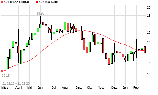 Mit dem Rücksetzer auf 14,90 EUR hat die Gesco-Aktie am 20.02.2026 die 100-Tage-Linie nach unten gekreuzt.