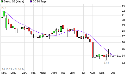 Mit dem Rücksetzer auf 13,90 EUR hat die Gesco-Aktie am 23.10.2024 die 50-Tage-Linie nach unten gekreuzt.