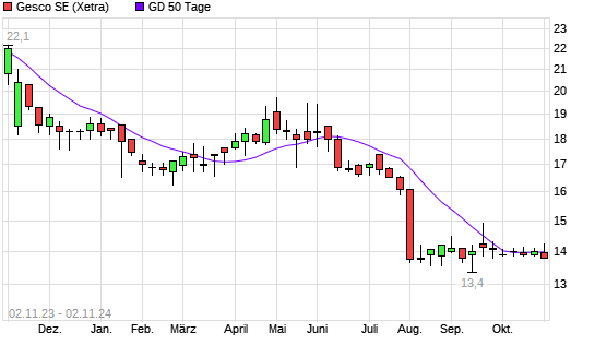 Mit dem Rücksetzer auf 13,90 EUR hat die Gesco-Aktie am 01.11.2024 die 50-Tage-Linie nach unten gekreuzt.