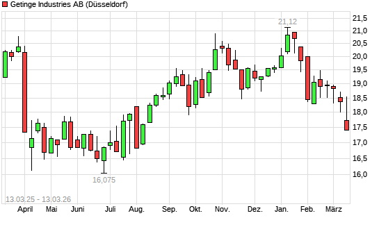 Mit dem Rücksetzer auf 17,81 EUR hat die Getinge Industries-Aktie (ISIN SE0000202624) am 12.03.2026 ein neues 6-Monats-Tief erreicht und damit den Kurs vom 09.03.2026 eingestellt.