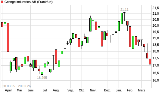 Mit dem Rücksetzer auf 16,97 EUR hat die Getinge Industries-Aktie (ISIN SE0000202624) am 19.03.2026 ein neues 6-Monats-Tief erreicht und damit den Kurs vom 16.03.2026 eingestellt.