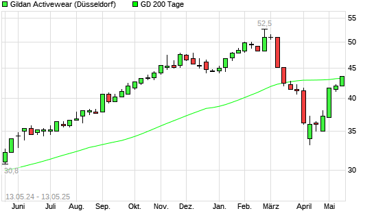 Mit dem Anstieg auf 43,80 EUR hat die Gildan Activewear-Aktie am 12.05.2025 die 200-Tage-Linie nach oben gekreuzt.