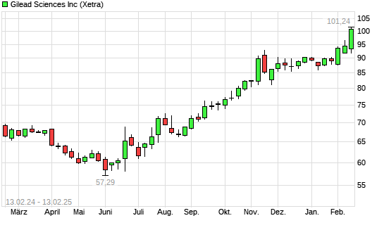 Mit dem Anstieg auf 99,50 EUR hat die Gilead Sciences-Aktie (ISIN US3755581036) am 12.02.2025 ein neues 5-Jahres-Hoch erreicht und damit den Kurs vom 03.02.2025 eingestellt.