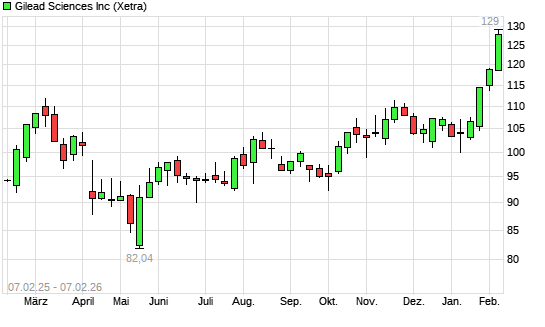 Mit dem Anstieg auf 128,62 EUR hat die Gilead Sciences-Aktie (ISIN US3755581036) am 06.02.2026 ein neues All-Time-High erreicht und damit den Kurs vom 05.02.2026 eingestellt.