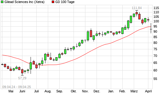 Mit dem Rücksetzer auf 94,12 EUR hat die Gilead Sciences-Aktie am 08.04.2025 die 100-Tage-Linie nach unten gekreuzt.