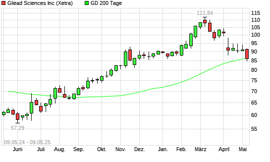 Mit dem Rücksetzer auf 86,39 EUR hat die Gilead Sciences-Aktie am 08.05.2025 die 200-Tage-Linie nach unten gekreuzt.