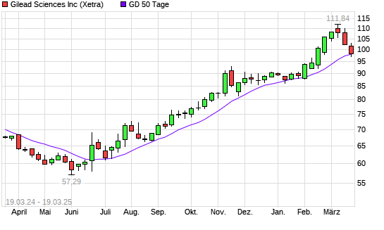 Mit dem Rücksetzer auf 97,59 EUR hat die Gilead Sciences-Aktie am 18.03.2025 die 50-Tage-Linie nach unten gekreuzt.