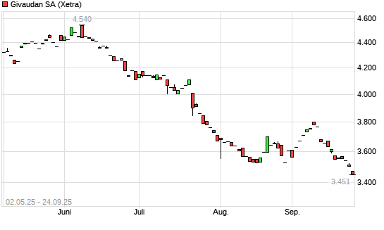 Mit dem Rücksetzer auf 3.458,00 EUR hat die Givaudan-Aktie (ISIN CH0010645932) am 24.09.2025 ein neues 12-Monats-Tief erreicht und damit den Kurs vom 23.09.2025 eingestellt.