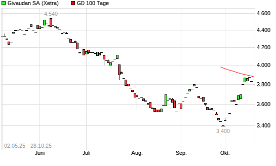 Mit dem Anstieg auf 3.831,00 EUR hat die Givaudan-Aktie am 27.10.2025 die 100-Tage-Linie nach oben gekreuzt.